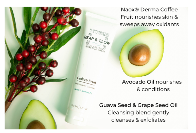 - Patented Naox® Derma Antioxidant Coffee Fruit deeply nourishes & sweeps away aging oxidants from skin.
